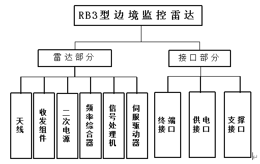 RB3型邊境監(jiān)控雷達(dá)由支撐部分、天線部分和接口設(shè)備組成,支撐部分根據(jù)安裝形式的不同可以選擇三腳架支撐,也可以選擇地面固定的支撐方式;天線部分包含天線罩、平面陣列天線、全固態(tài)收發(fā)組件、二次電源、頻率綜合器、信號(hào)處理機(jī)以及伺服驅(qū)動(dòng)器;接口部分包含供電單元和終端顯控單元。系統(tǒng)組成框圖如下圖所示。